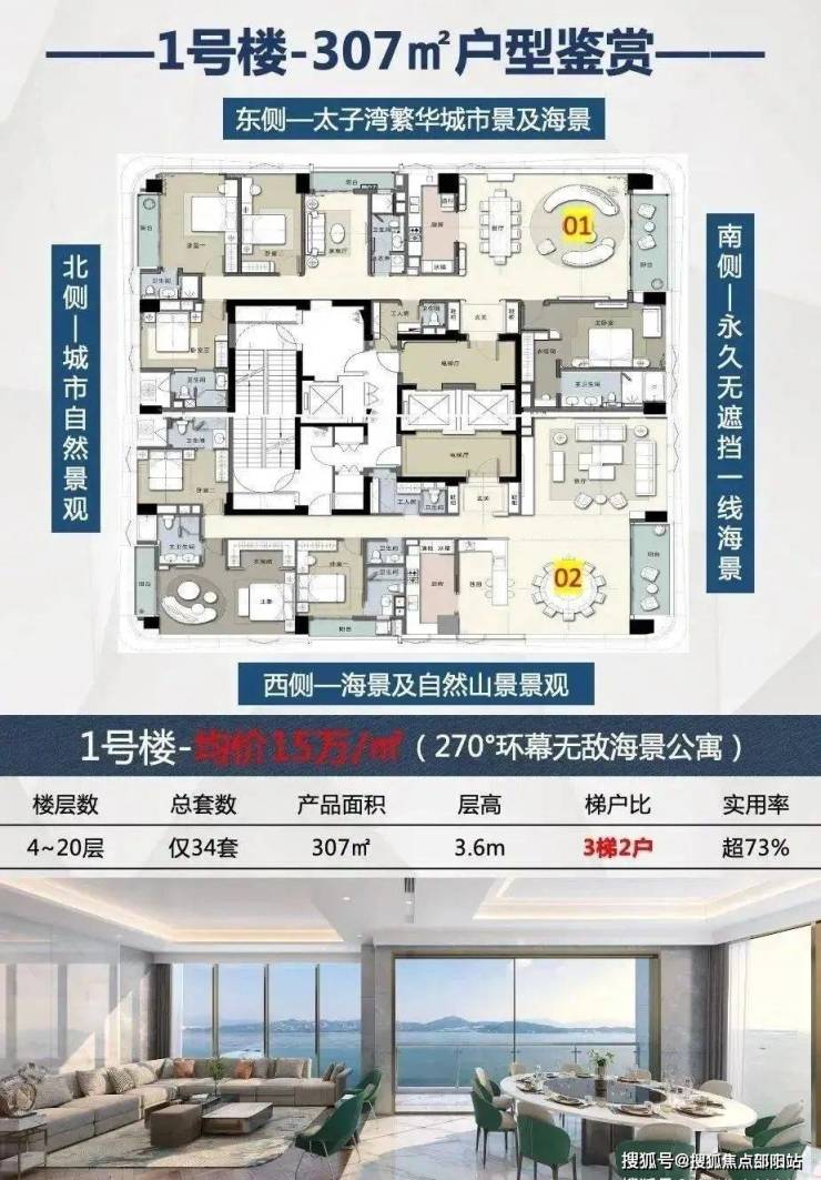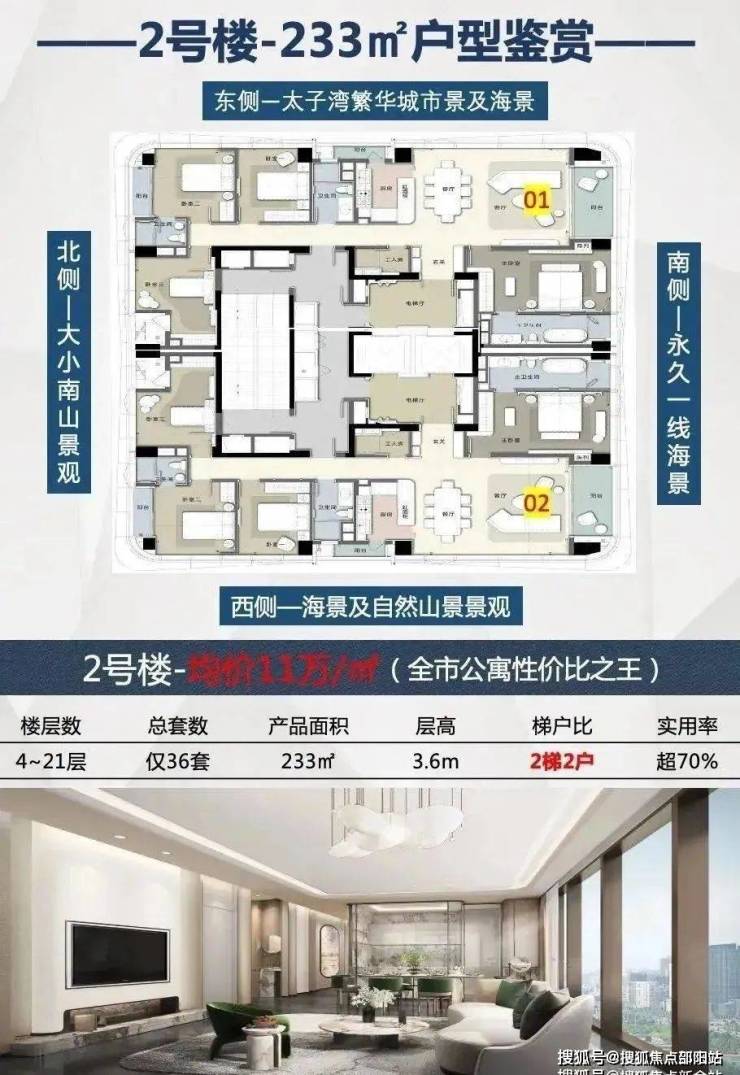 地址:深圳市南山区港湾大道与沁海路交汇处占地面积:0.5㎡总建面:2.3万㎡产权:40年(年)总户数:70户面积:233㎡4+1房3卫,307-309㎡4+1房3厅5卫车位比:127个1:1.8梯户比:3梯2户/2梯2户价格:单价6.9-11万交楼标准:毛坯/精装物业公司:长富物业物业管理费:12.8元/㎡容积率:4.52绿化:22%交楼时间:现楼建筑类型:公寓层高:3.6米使用率:75%楼层高:1单元25层,2单元21层栋数:2栋水电:民水民电商业:自带5万㎡(华润运营)学校:育才二中、育才一小、太子湾学校、深圳湾学校、南外滨海