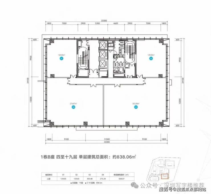 B栋面积:129㎡、274㎡、303㎡、至整层838㎡