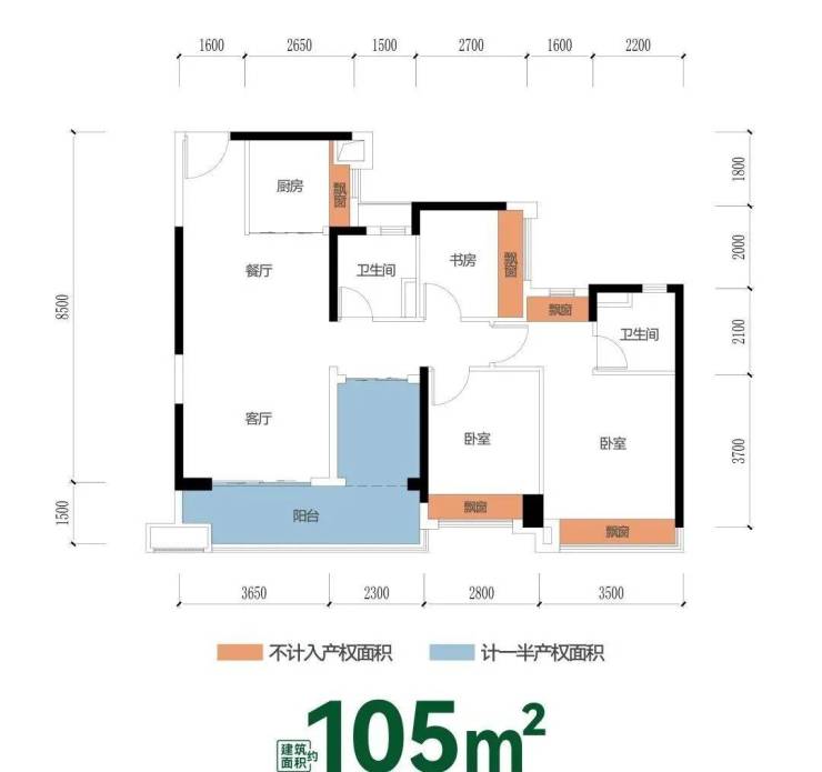 主卧双飘窗+次卧等面宽飘窗,全赠送高拓空间