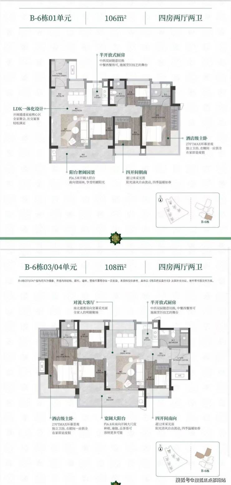 整个社区围合式布局,采用风车形楼型,取消北向户型,全南向排布,同等面积,朝向更佳;基本实现四开间以上,保证两个以上卧室南向,比同等南向产品品质感更强。