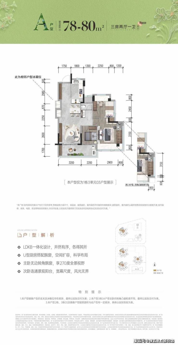 78-80㎡的3房2厅1卫,设计的是竖厅格局,客厅3.2米开间,LDKB一体化,S墙设计预留冰箱卡槽位,动静分区,主卧270无边转角飘窗,3个卧室分别做到了主卧16.62㎡/次卧9.27㎡/次卧5.72㎡(包含墙体飘窗),客厅连接次卧出5.4米长的大阳台,U型厨房,卫生间三段式分离,得房率约93-99%(包含赠送),西北朝向。