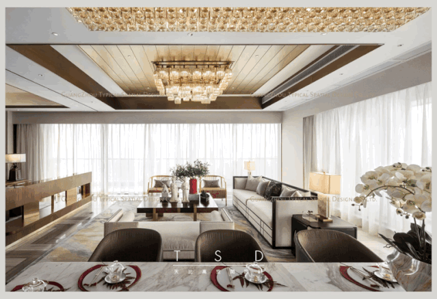 入门口,即可看到开间5.45米,进深8.6米的大型客厅,感官十分奢阔。
