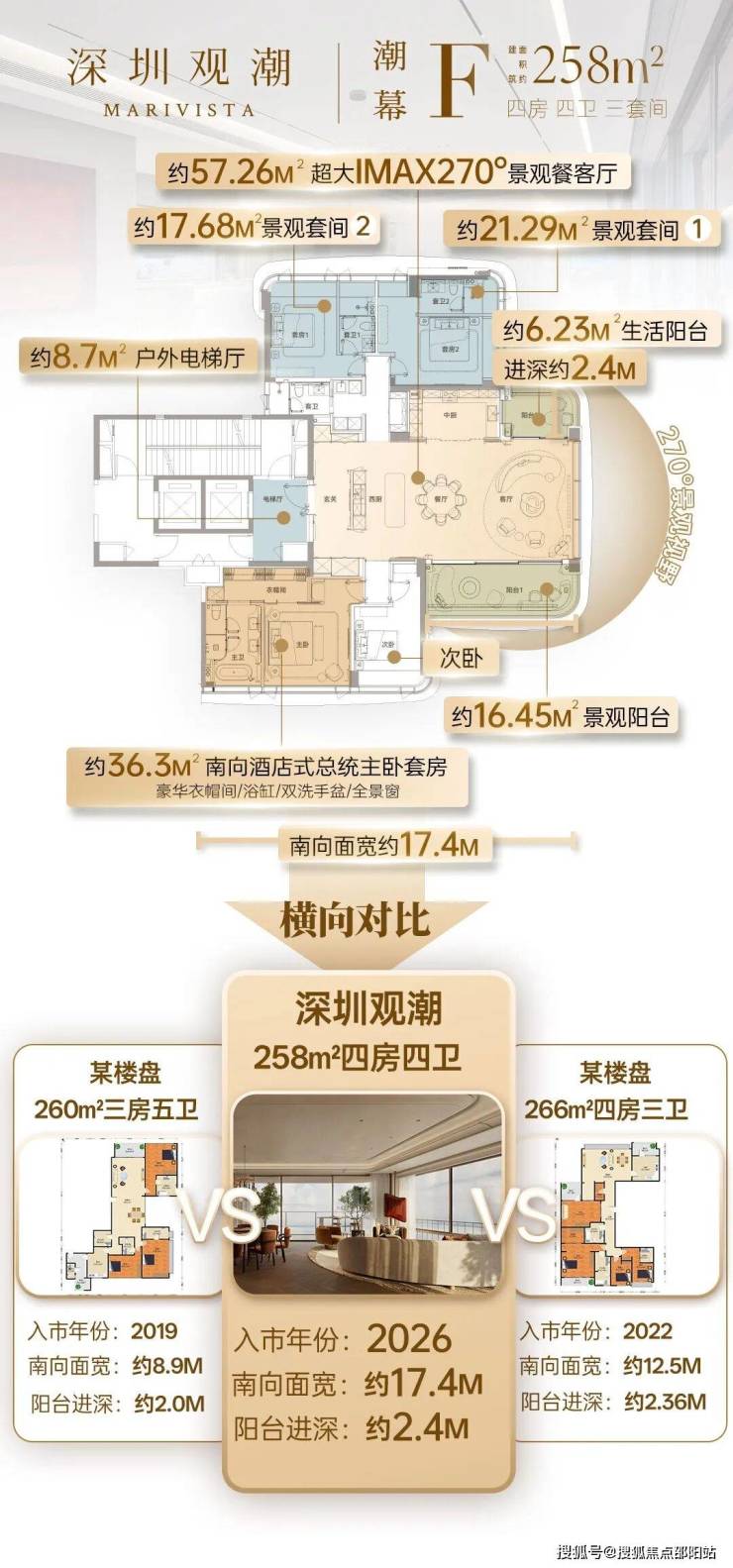 而与近些年入市的深圳豪宅相比,深圳观潮全景舱户型的优势在于将一切体验放大,拥有超大南向面宽、超阔绰阳台以及超级公区——深圳观潮约258㎡四房,南向面宽约17.4米,餐客厅面积约57㎡。