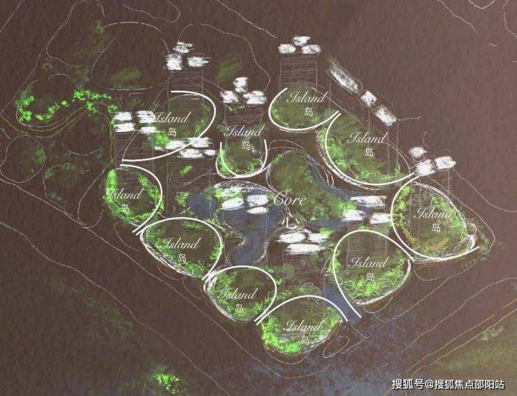 再往里走,整座底盘最核心的部分——约5.3万㎡的三层立体滨海园林。设计灵感来自澎湃大海中的“海心岛”,以“森海·浮屿”为概念,整个项目被理解为“海心”底盘上漂浮的10栋“岛屿”楼宇。