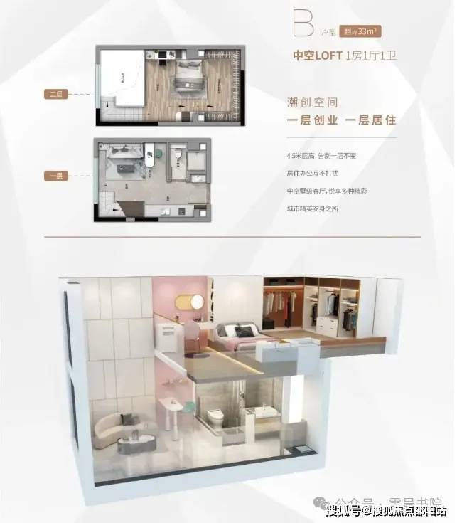 B户型建筑面积约33㎡,中空LOFT设计,既适合创业又适合居住;