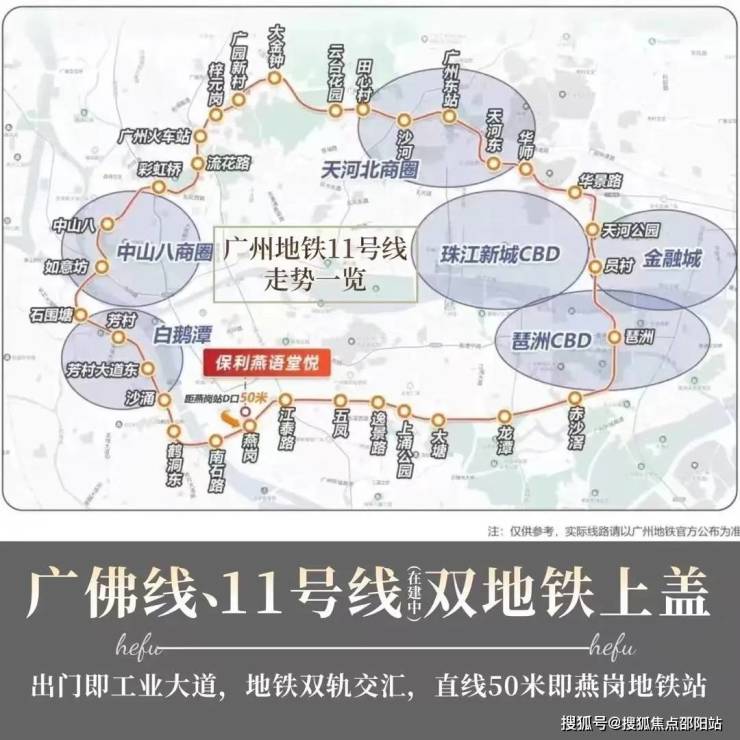 地铁:双地铁上盖,线路四通八达,项目直线50m就是燕岗地铁站。第一广佛线,已开通,可以链接佛山新城、千灯湖、荔湾芳村等区域。第二就是11号线,今年开通,广州首条环线,换乘之王,可以链接全城。