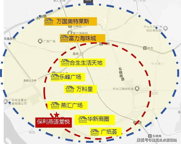 其中家门口工业大道中商圈(华新方圆333、燕汇广场、江燕路万科里、海珠合生生活天地等),5分钟可达江南西商圈(广百广场、富力海珠城等),达宝业路商圈(乐峰广场、宝业路美食街等),太古仓商圈等大型商圈。