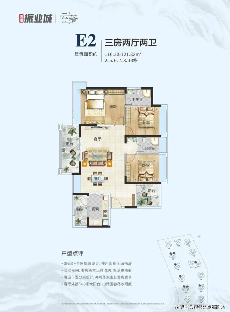 E2户型: 116-121㎡三房两厅两卫;全屋飘窗设计,灵动改造房间;双主卧改造设计,约4.8m大阳台