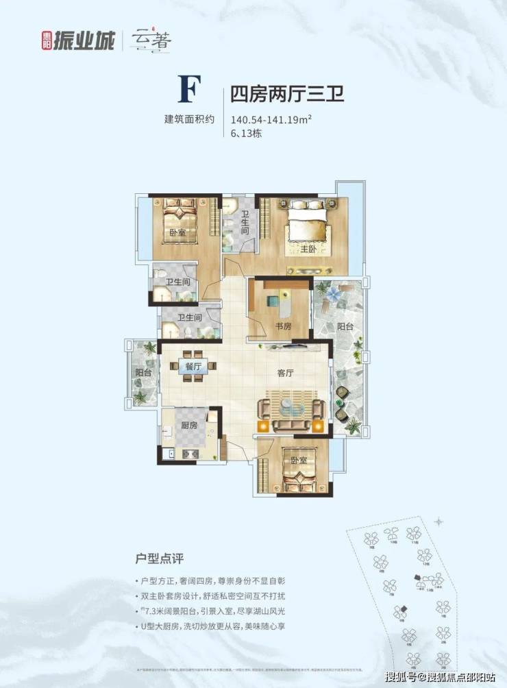 F户型: 140㎡四房两厅三卫;方正户型构造,双主卧套房设计;约7.3m阔景阳台,U型厨房构造