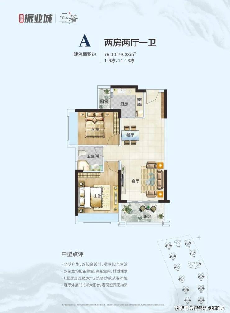 A户型:76-79㎡两房两厅一卫;全明户型设计,L型厨房构造;高拓空间设计,3.5米大阳台