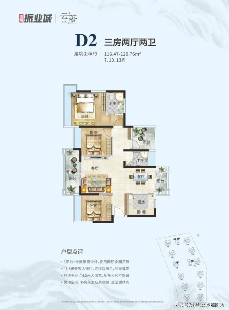 D2户型: 116-120㎡三房两厅两卫;三阳台设计,约7.6米客餐厅;主卧大飘窗设计,灵动改造空间
