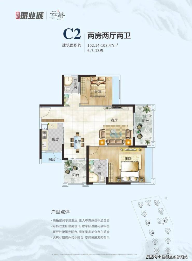 C2户型: 102-103㎡两房两厅两卫;高拓空间享受,灵动双主卧设计;约7米客餐厅,独立生活阳台构造