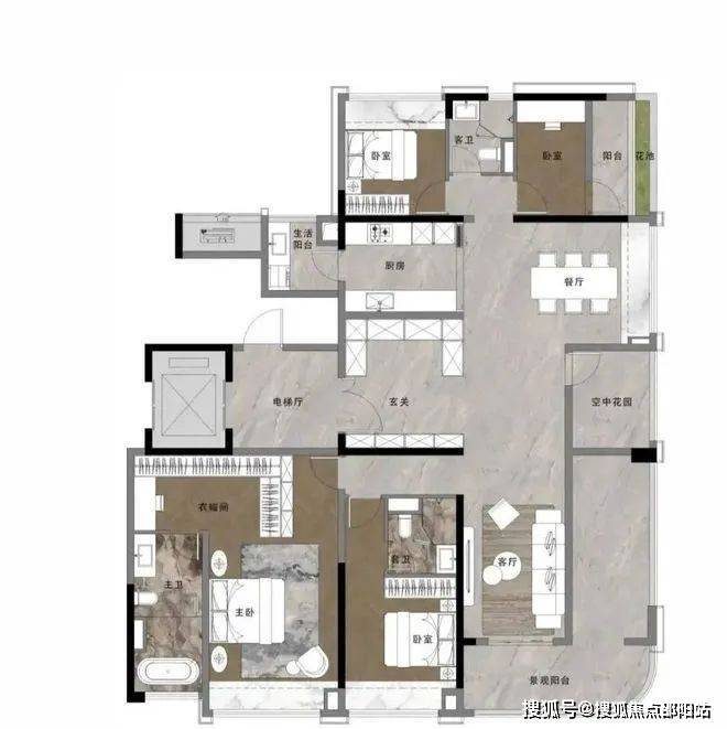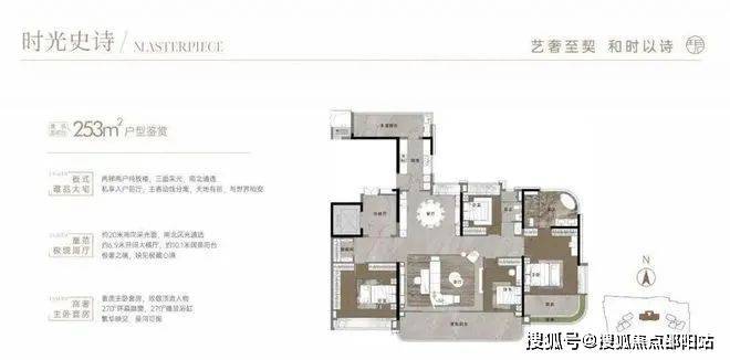 203平是四房两厅三卫户型,竖厅双主套设计,动静分区明显,特点是阳台的270度弧形飘窗非常大气,还有一个独立的空中花园。