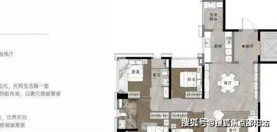 157平是四房两厅两卫户型,是传统的竖厅设计,动静分区,厨房后面有一个生活阳台,主卧设计了270度弧形飘窗,视野采光好。
