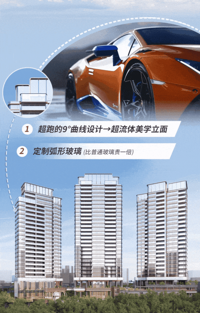 过去几十年,广州几乎99%豪宅,立面设计都会抛出一个尖锐直角,都荟天珺再次独树一帜,运用超跑的曲线设计,为项目带来了超流体美学立面。这样的曲线型建筑,因成本昂贵,只有少数地标级国际顶豪才能见到。