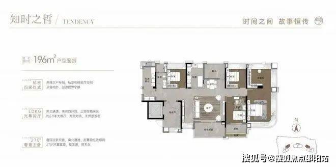 196平是四房两厅三卫户型,竖厅双主套设计,客厅开间将近7米,主卧有一个独立的衣帽间,飘窗比157平更大,更加大气。