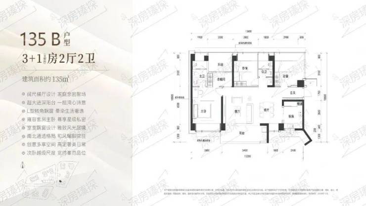135㎡的4房2厅2卫,B户型(2栋4单元06户型),设计的是横厅南北通透格局,进门入户玄关,客餐厅7.2米开间,LDKB一体化设计,四开间朝南,4个卧室分别做到了主卧19.08㎡/次卧14.3㎡/次卧11.7㎡/次卧11.7㎡(包含墙体飘窗),客厅连接次卧出6.8米长的观景大阳台看深大校区,U型厨房,卫生间干湿分离,得房率约90%(包含赠送),阳台主朝西南向。152㎡的4房2厅2卫,3栋2单元01户型,设计的是横厅南北通透格局,进门入户玄关,客餐厅7.7米开间,LDKB一体化设计,四开间朝南,4个卧室分别做到了主卧21.17㎡/次卧12.4㎡/次卧11.7㎡/次卧11.7㎡(包含墙体飘窗),客厅出5.1米长阳台,L型厨房带1个生活阳台,公卫三段式分离,得房率约90%(包含赠送),东南朝向。