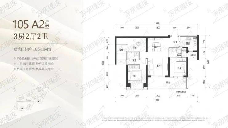 103-104㎡的3房2厅2卫,A2户型(2栋4单元/3栋2单元03户型),设计的是竖厅类双龙抱珠格局,客厅3.6米开间,客餐厅一体化设计,3个卧室分别做到了主卧12.8㎡/次卧12㎡/次卧8.7㎡(包含墙体飘窗),客厅连接次卧出6.5米长的宽景大阳台,U型厨房,公卫三段式分离,得房率约90%(包含赠送),正南朝向。跟A1户型除了朝向不一样,其它都是一致的。