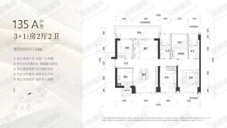 134㎡的4房2厅2卫,A户型(1栋1/2单元05户型),设计的是竖厅南北通透格局,进门入户玄关,客厅4.2米开间,LDKB一体化设计,四开间朝南,4个卧室分别做到了主卧19.44㎡/次卧10.64㎡/次卧10.26㎡/次卧7.8㎡(包含墙体飘窗),客厅连接次卧出6.8米长的观景大阳台看深大校区,U型厨房,卫生间干湿分离,得房率约90%(包含赠送),西北朝向。