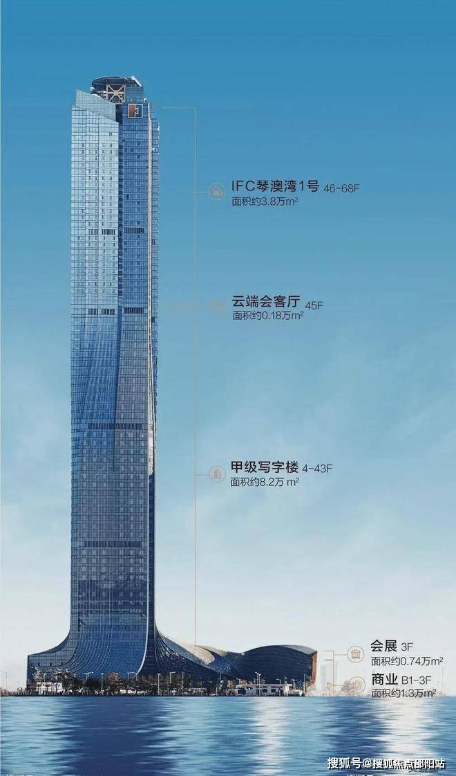 建筑面积约219220平方米,其中地上建筑面积约138531平方米,地下建筑面积约80689平方米,建筑高度为332.7米,是珠海第一高楼,塔楼分为地上69层、地下4层,由一座集合了办公和公寓的超高层塔楼以及连于一体的地面裙楼组成。其功能主要包含甲级写字楼、配套会展功能、商务公寓及商业服务设施。