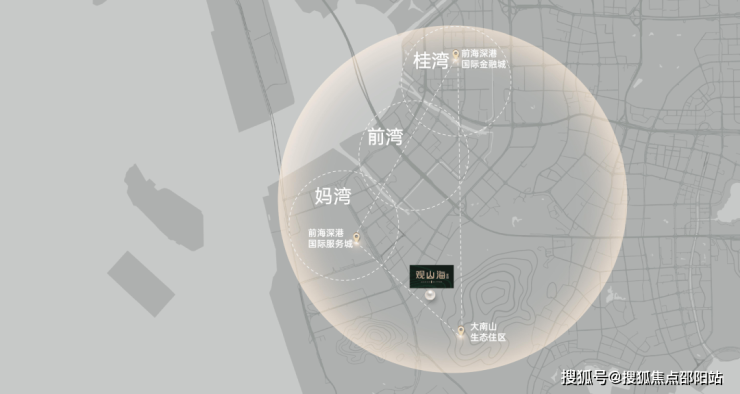 项目处于前海合作区大、小南山片区西组团,片区未来规划形成前海"黄金三角",即三湾两城一山:三湾为桂湾、前湾、妈湾,两城为深港桂湾金融城+妈湾深港国际服务城,一山为大南山生态居住区。项目东侧为前海核心商务区(桂湾国际金融城),西侧为妈湾深港国际服务城,兼具繁华与生态宜居双重属性。