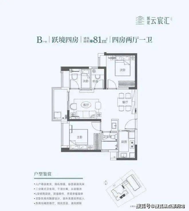 81㎡的4房2厅1卫,设计的双龙抱珠格局,餐客厅一体化,L型厨房,东南朝向,这个面积段能做到4房现在的市面上非常难得。