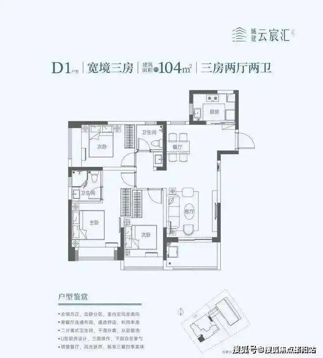 104㎡的3房2厅2卫,设计的竖厅南北通透格局,餐客厅一体化,U型厨房,阳台西南朝向。