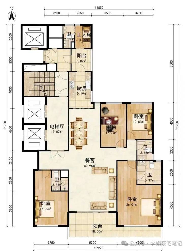 170㎡四房:套内面积达220㎡(赠送50㎡),三卧+客厅朝南,3梯2户专梯入户,保姆套房独立设计。