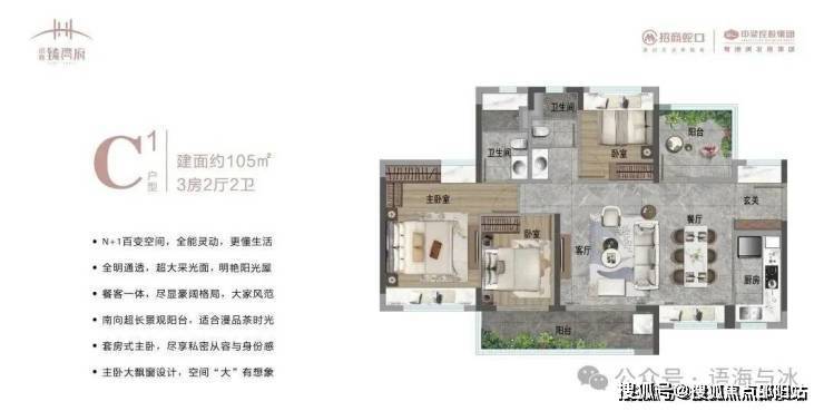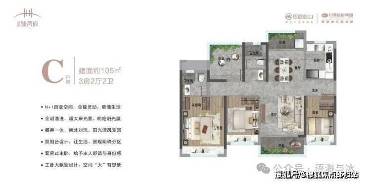 105㎡3+1房:南北双阳台设计,南向6米景观阳台,主卧套房带独立衣帽间,改善升级首选。