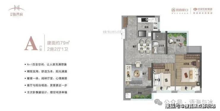 79㎡2+1房:3开间朝南,主卧带飘窗,N+1空间可改造为书房或儿童房,适合年轻家庭。