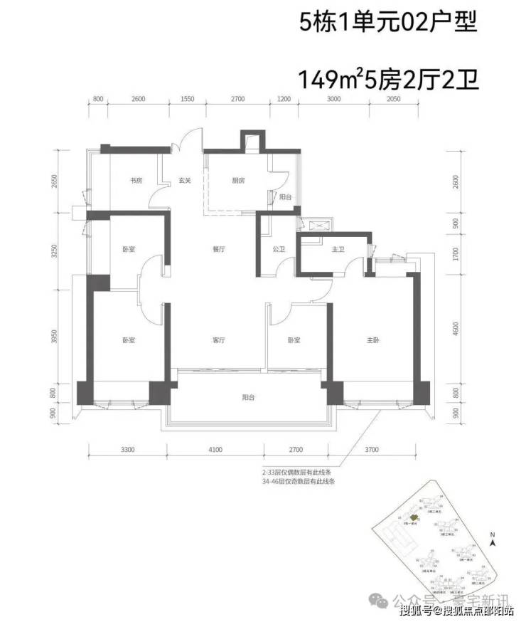 【五栋一单元-平面图】3梯3户,3条腿,分别是01、03号房户型约173㎡的5房2厅2卫、02号房户型约149㎡的5房2厅2卫