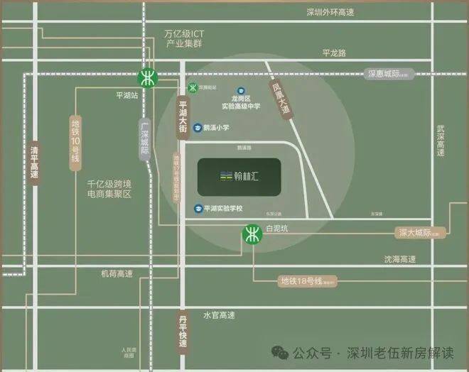 区位方面,岗宏翰林汇位于龙岗区平湖街道平湖大街与湖岭路交汇处,南侧在建园岭学校,还有平湖实验学校,作为深圳17个重点发展区域之一,平湖的定位是“金融+科技+总部”为特色的战略新兴产业基地,并且平湖也是深圳跨境电商产业主要聚集地之一,跨境电商总量及规模处于全市领先地位。