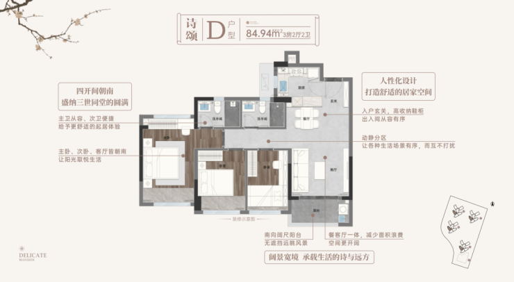 约84㎡的极品户型,拥有超大开间朝南,每个卧室都朝南向,一流的采光通风,满足家人健康舒适生活。
