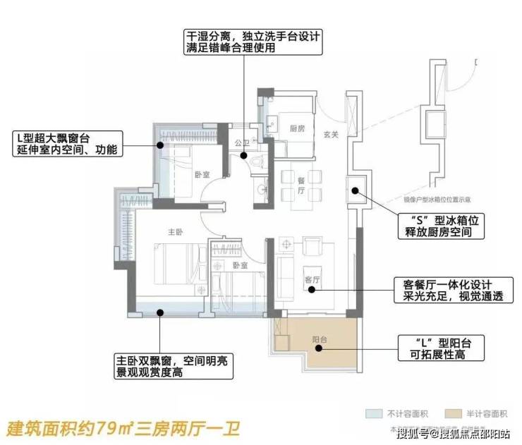 79㎡三房一卫:总价190万起,南向或南北通透设计,得房率约73%-80%;