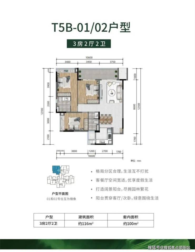 :3 房 2 厅 2 卫,建筑面积约 115m²,套内面积约 100m²。南北通透,创意景观餐厅,阳台贯穿客厅和次卧,奢阔主卧套房,享受高品质旅居生活。