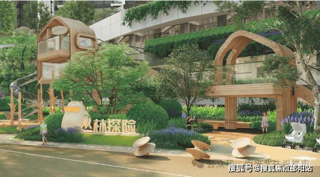 设置瞭望塔、树屋、攀岩墙等分龄段游戏区,高绿量的户外亲子互动场地。