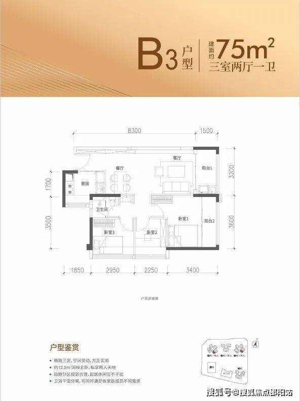特点:LDKB一体化设计,主卧13.24㎡(含飘窗),次卧8.85㎡(含飘窗),次卧6.75㎡(含飘窗)。