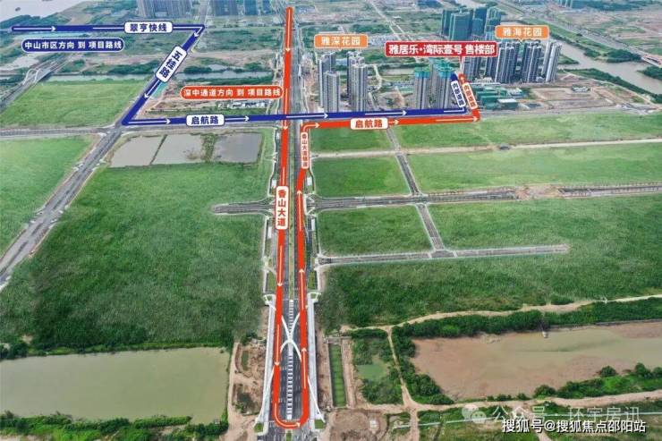 出翠亨收费站,走未来大道接驳横门路,转香山大道,香山大道直行至尽头-左转调头上香山大道路辅路-十字路口右转沿启航路行驶-左转至内部道路直行至项目营销中心