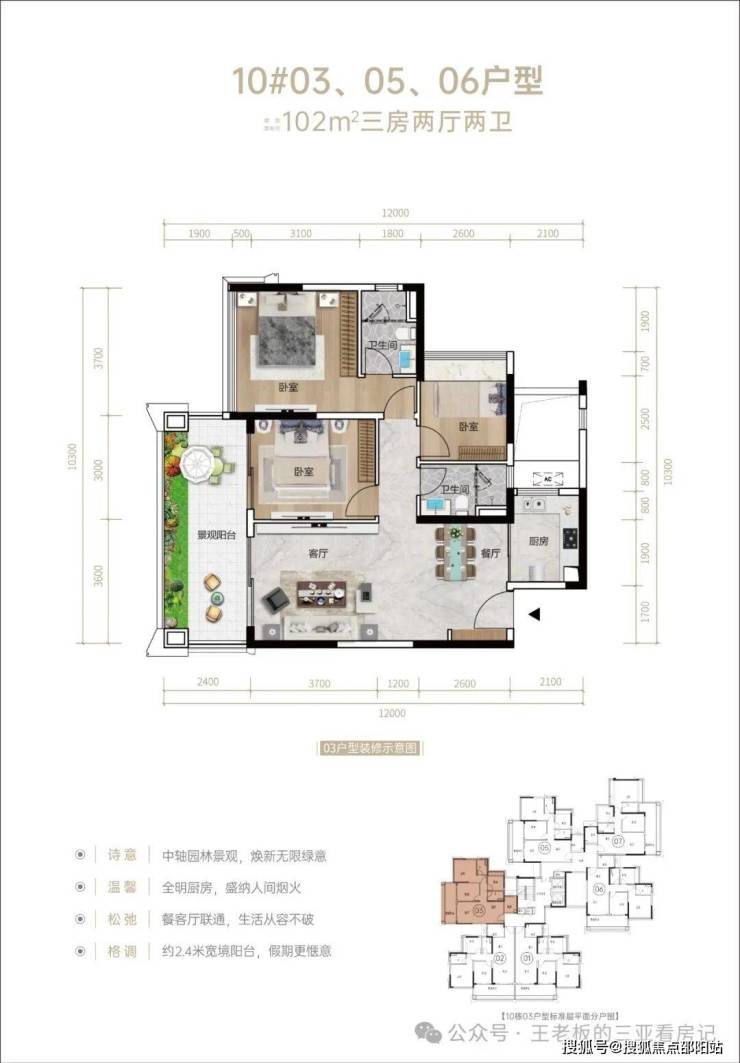 ❥❥10#2T6(03/05/06号位户型鉴赏)🏡约102㎡三房两厅两卫,🏡风车行布局,实现每个户型的单边采光、观景视野🏡南北对流,空气流通俱佳🏡高楼层可观山海,对望田园屋舍,视野无遮挡