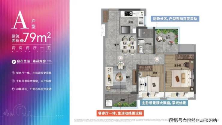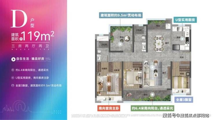 不到百平空间亦可实现轻松满足二孩家庭、三代同堂或居家办公等多元需求。全屋南北通透,空气对流顺畅,阳光洒满每个角落。特别值得一提的是餐厨一体化设计,通过空间联动与厅区扩容,打造出约15㎡超大餐厨空间,居住体验完全不输建筑面积约90平以上的户型。