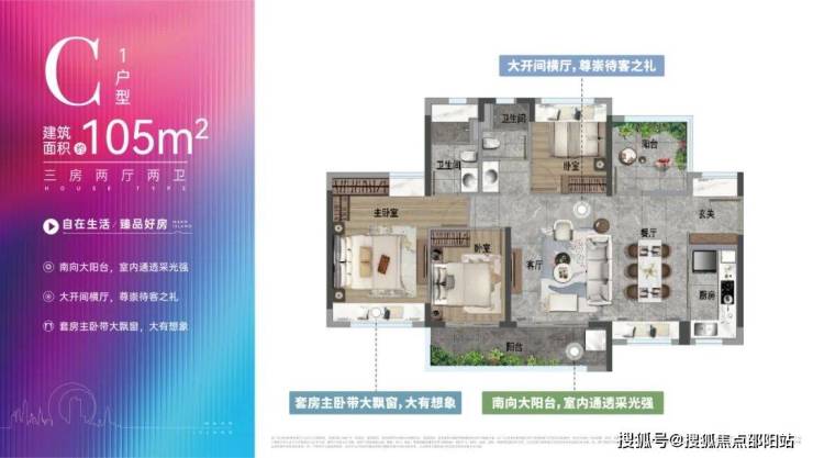 整体双南双北的户型布局,户型东西总进深近14米,南向阳台近6米宽,南北通透,视野开阔。