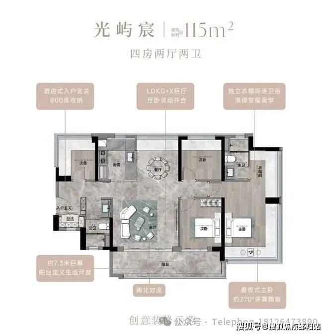 115㎡的4房2厅2卫,设计的是竖厅南北通透格局,进门入户玄关,客厅4.45米开间,餐客厅分离设计,客厅连接次卧出10.87m²的观景大阳台,L型中式+岛台灵动式厨房,公卫三段式干湿分离,得房率约78.27%(不含赠送),阳台主朝东南或西南向。靓点:南北对流+7.25米长超大观景南向阳台,超大主卧+270°无柱转角飘窗