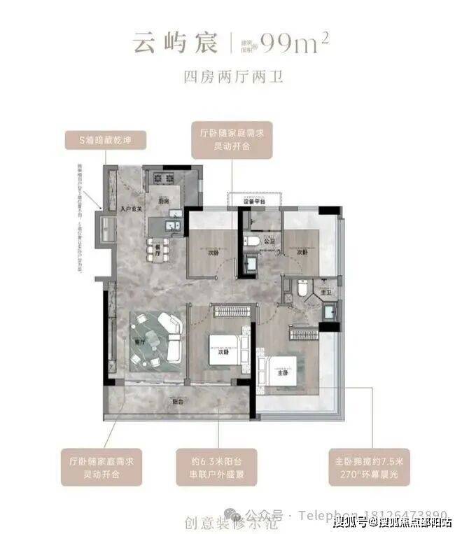 99㎡的4房2厅2卫,设计的是竖厅格局,客厅3.35米开间,LDKB一体化,S墙设计预留双开门冰箱卡槽位,三开间朝南,动静分区,U型厨房,公卫三段式干湿分离,赠送设备平台,得房率约78.27%(不含赠送),客厅连接次卧出9.37m²大阳台西南或东南朝向。靓点:99平做到了4房2卫,主卧270°无柱转角飘窗,厨房烟道外置+额外赠送设备平台,并且是纯南向格局。