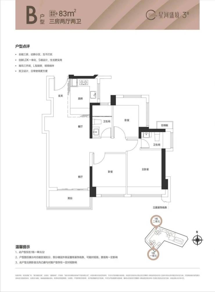 83㎡的3房2厅2卫(1栋1单元01/02户型),设计的是竖厅格局,创新LDK一体化餐客厅,S墙设计预留冰箱位,三开间朝南,次卧270度环幕设计,U型厨房,卫生间干湿分离,得房率80.07%(不含赠送),全部西南朝向。