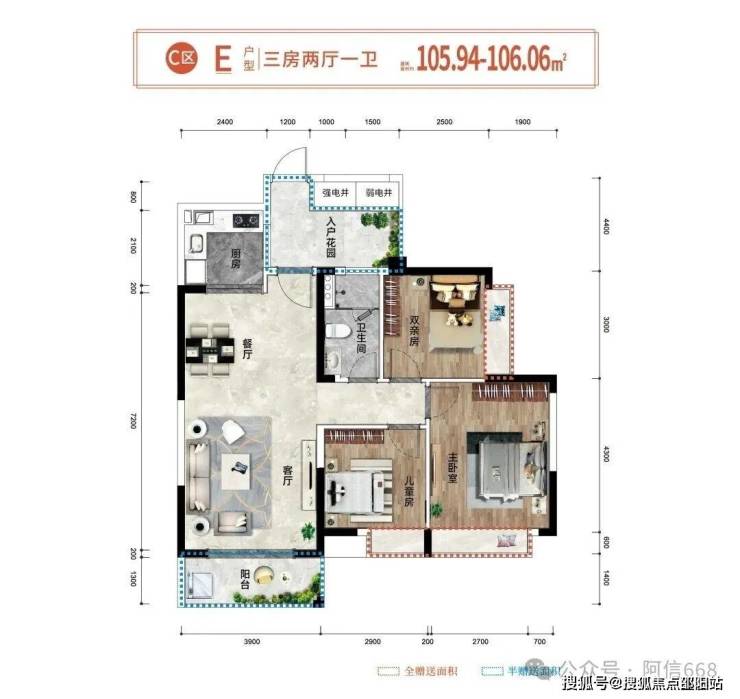 1、105平米三房一卫