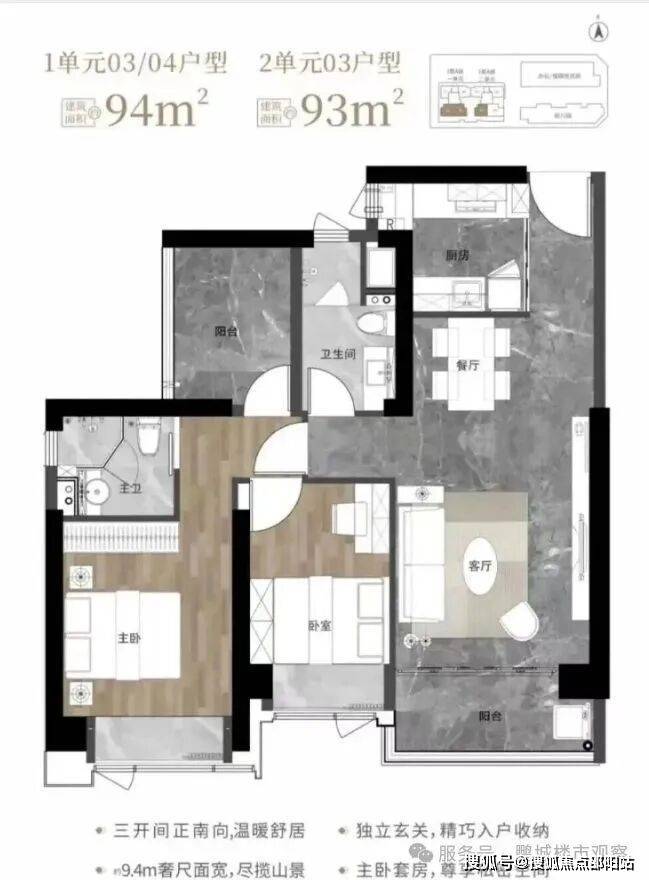 93-94㎡的3房2厅2卫,1栋1单元03、04户型/1栋2单元03户型,设计的是经典竖厅格局,客厅3.6米开间,LDKB一体化设计,动静分区,三开间朝南,9.4米面宽,二字型厨房,卫生间干湿分离,阳台正南朝向。