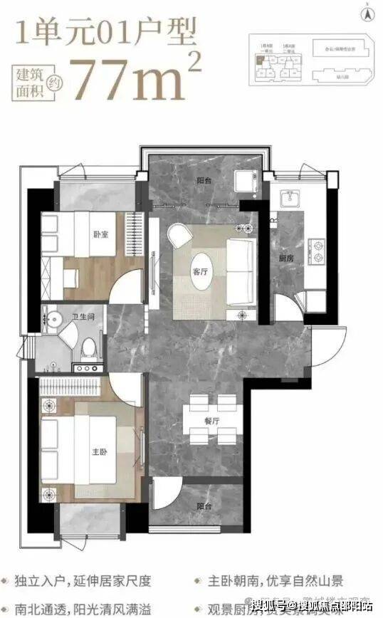 77㎡的2房2厅1卫,1栋1单元01户型,设计的是竖厅南北通透格局,独立入户,客餐厅分离设计,动静分区,南北双阳台,L型厨房,卫生间干湿分离,客厅阳台正北朝向。小户型里面难得可以做到南北通透且有双阳台的格局。