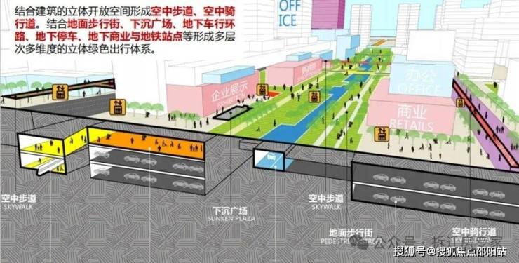 立体交通——未来片区多层次、多维度的立体绿色出行体系。双地铁上盖,市政规划的空中连廊系统,“0”距离接驳全城。