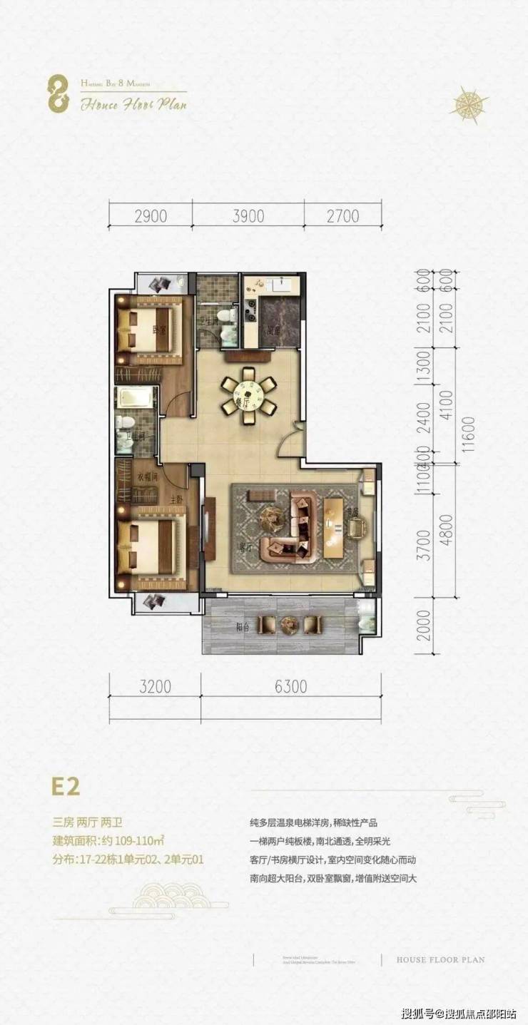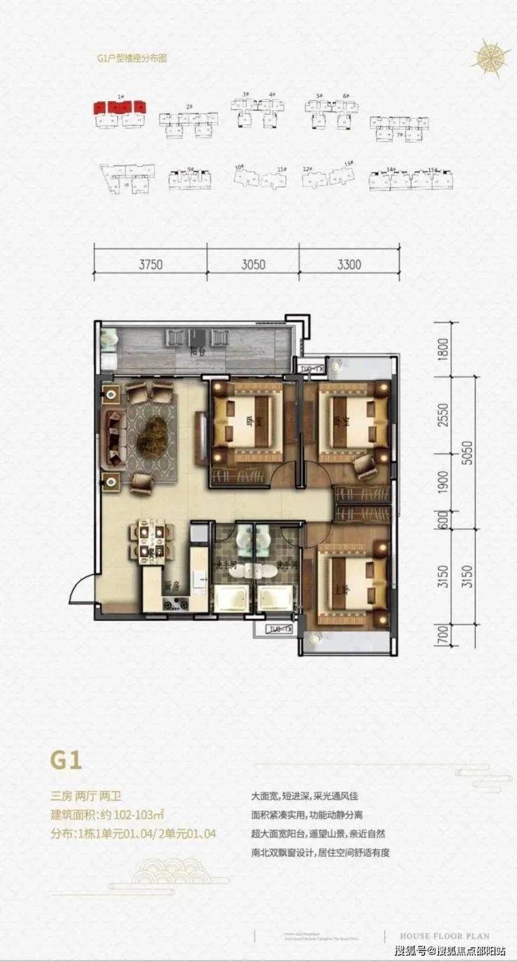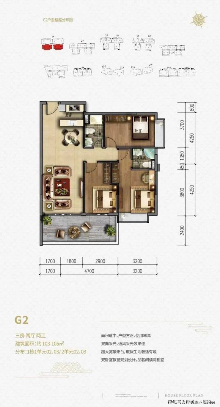 一单元两梯4户,二单元2梯3户,13层高,三房两厅两卫,超大2.4-2.75m阳台开间,双户型全朝南设计。