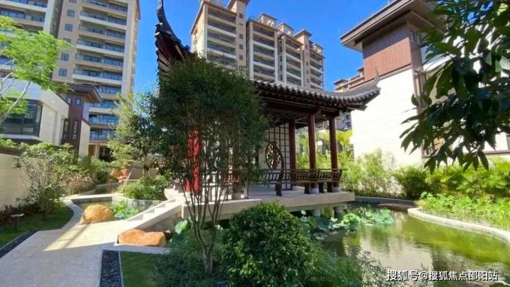 中央水系景观以逐浪庭,渠水庭,银锭桥,浮云庭,月亮门,结合三亚丰富的热带植被花卉进行绿化铺陈,打造中正大气、绿意盎然、小桥流水、生机勃勃动静结合的项目建筑景观全系风貌。